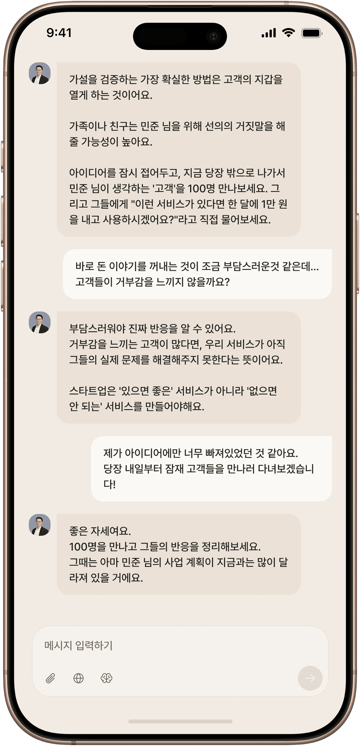 클론과의 1:1 대화에서 신뢰가 쌓이고, 그 신뢰가 자연스럽게 전환으로 이어집니다.