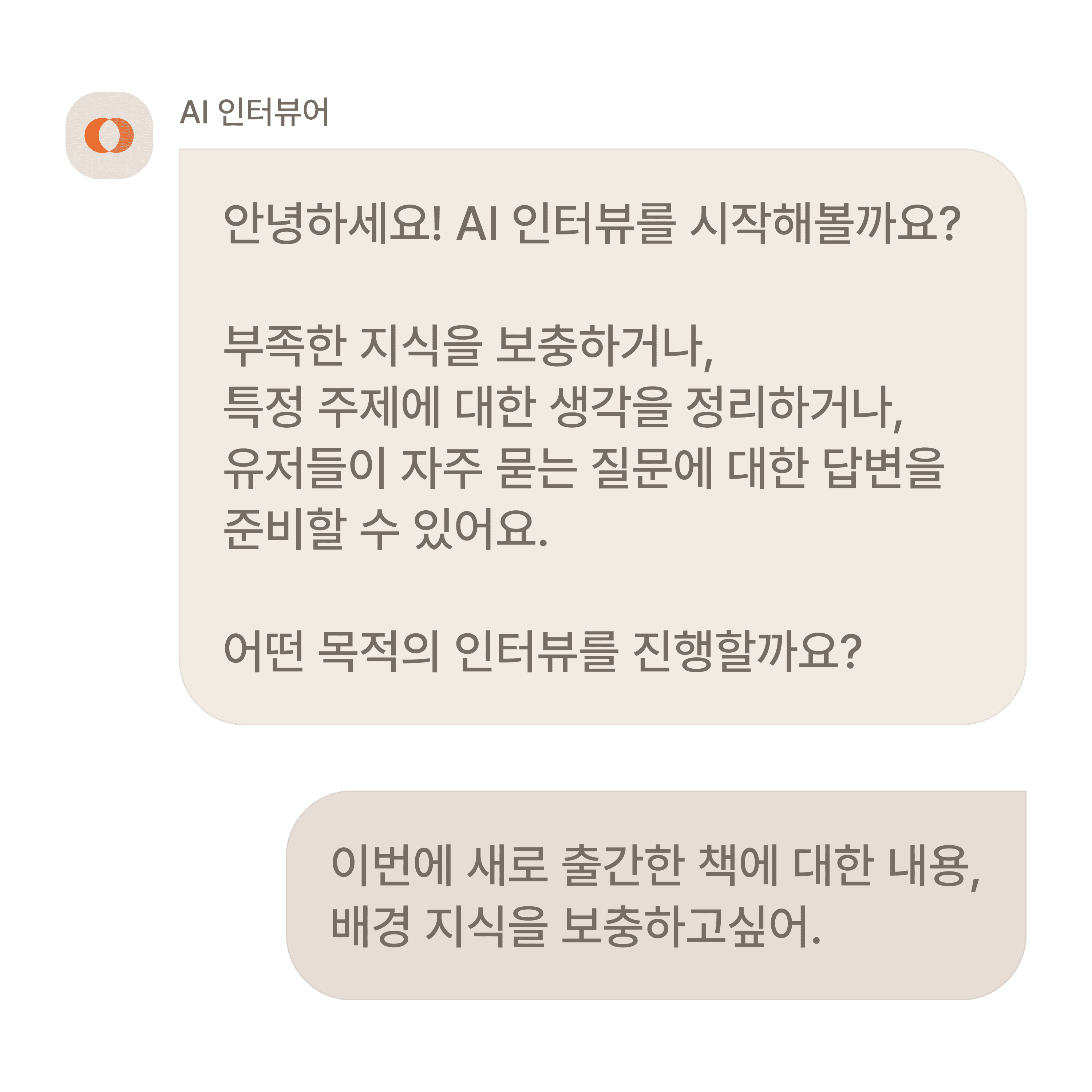 주제만 정하면 AI가 상세히 질문하고, 내 답변 내용을 학습해요.